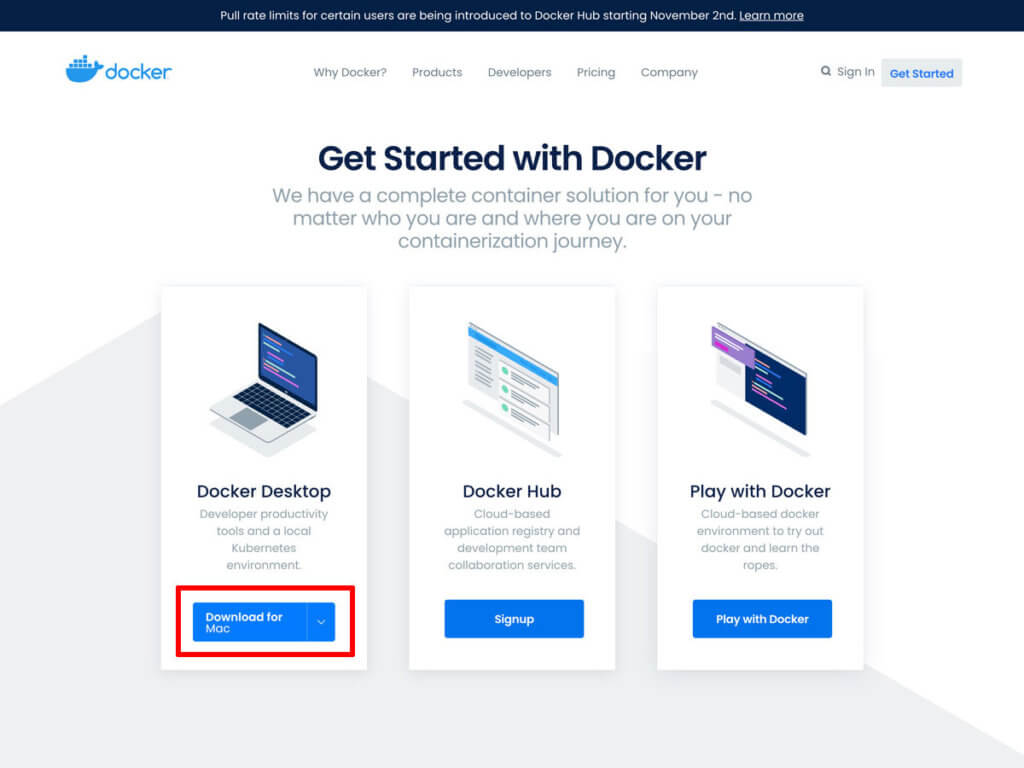 まずはDockerの公式サイトへアクセス。