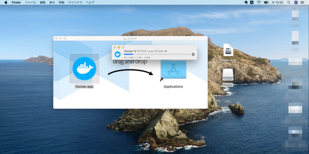 その後、.dmgが開いた後、画面に従いApplicationsフォルダへ移動し、インストール完了です!