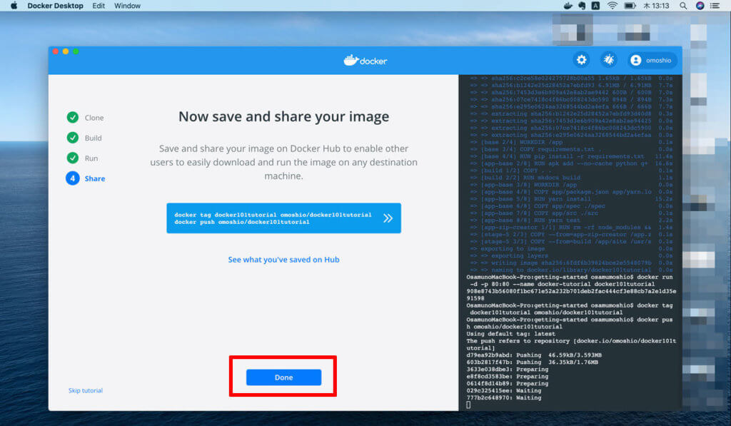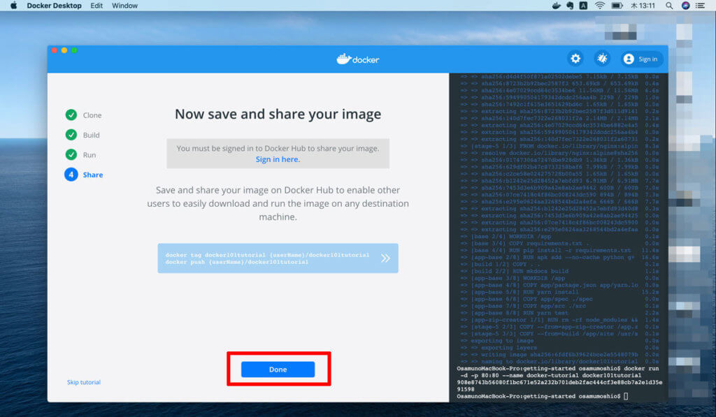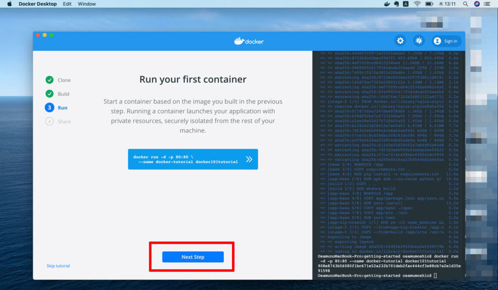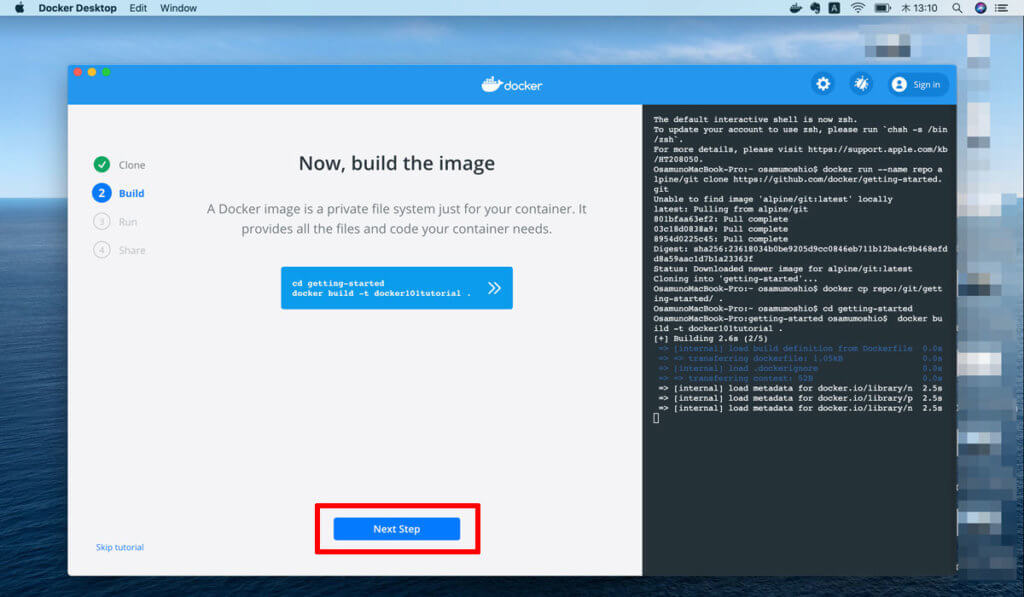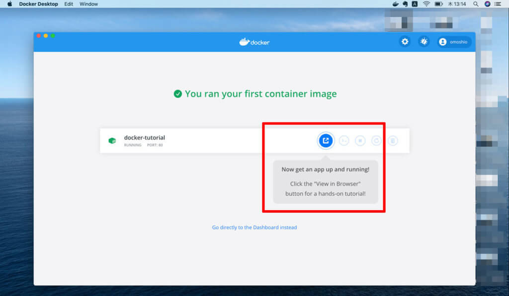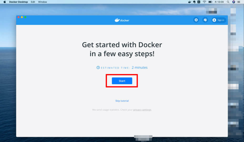 ですが、難しいことはなくDockerに表示されるガイドに従ってポチポチと進めていきます。