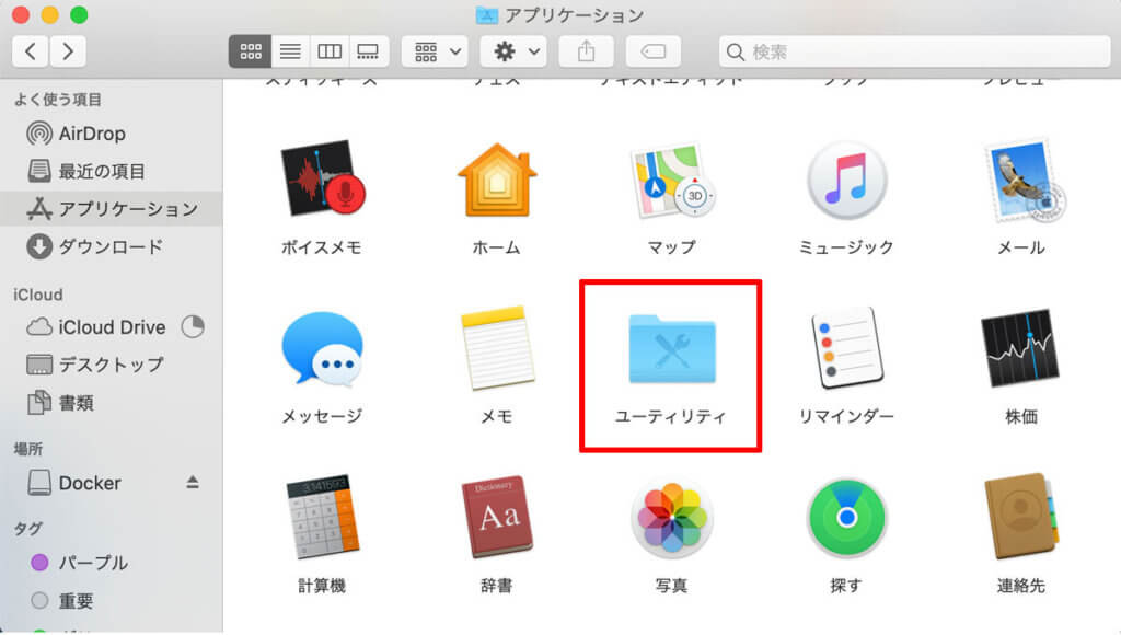 ↑「アプリケーションフォルダ」にDockerがインストールされています!
