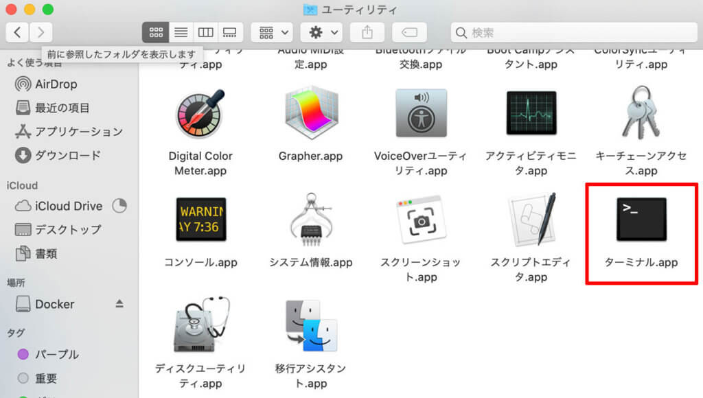 MACのファインダーから「アプリケーション→ユーティリティ→ターミナル」を起動します。