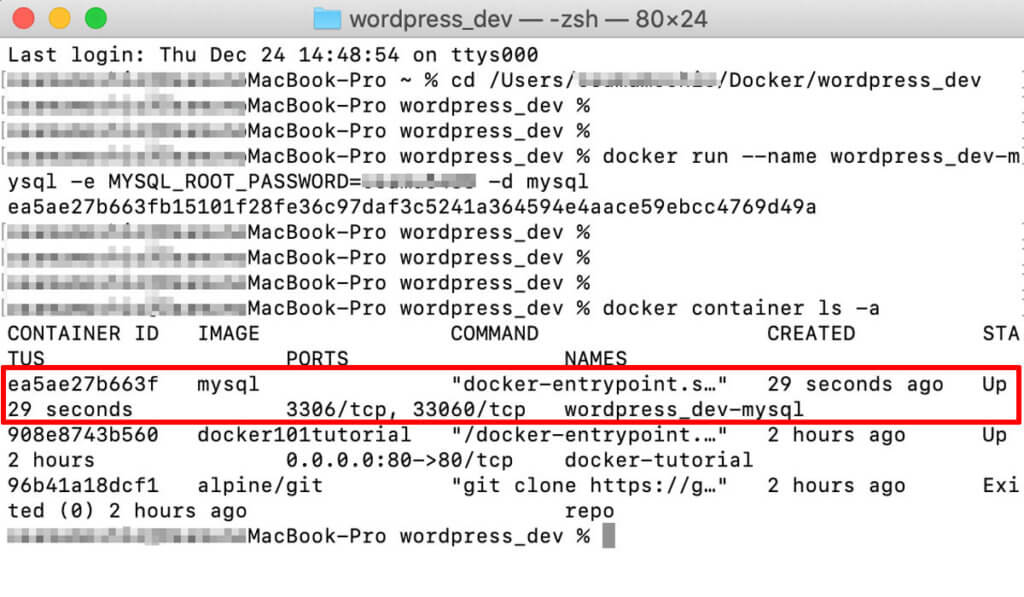 docker run —name wordpress_dev-mysql -e MYSQL_ROOT_PASSWORD=[任意のパスワード] -d mysql