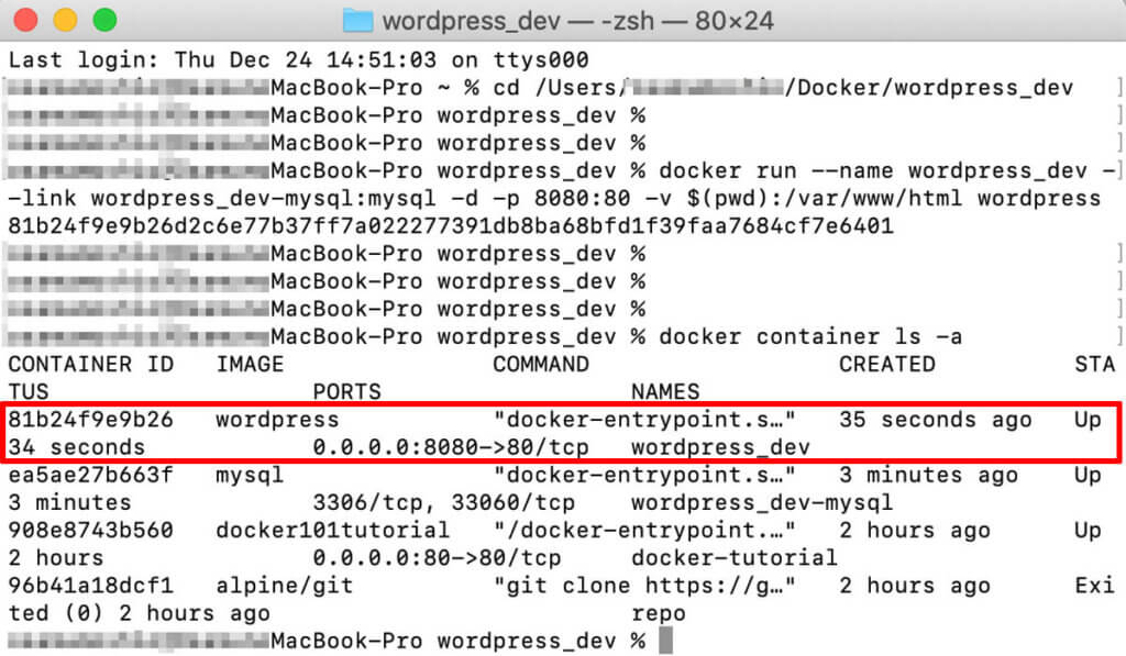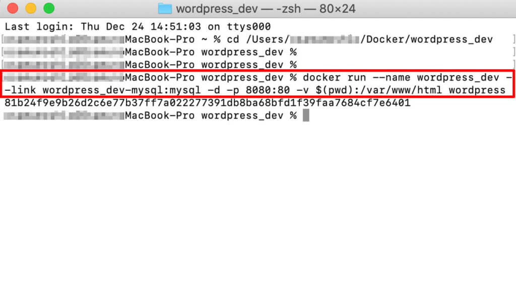 docker run —name wordpress_dev —link wordpress_dev-mysql -d -p 8080:80 -v $(pwd):/var/www/html wordpress